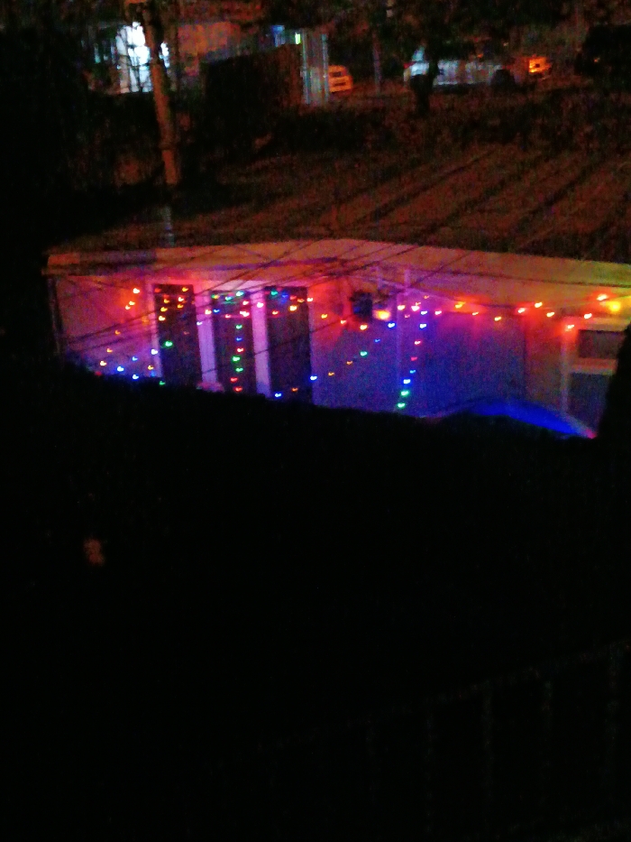 A long, low-lying structure is outlined by strings of colorful lights. The building is rectangular with vertical openings that appear to be doorways. The interior is dimly lit, glowing with a faint purple hue. The structure sits against a dark, undefined landscape, with hints of trees and buildings in the background. The foreground is obscured by deep shadow and a section of a fence.
