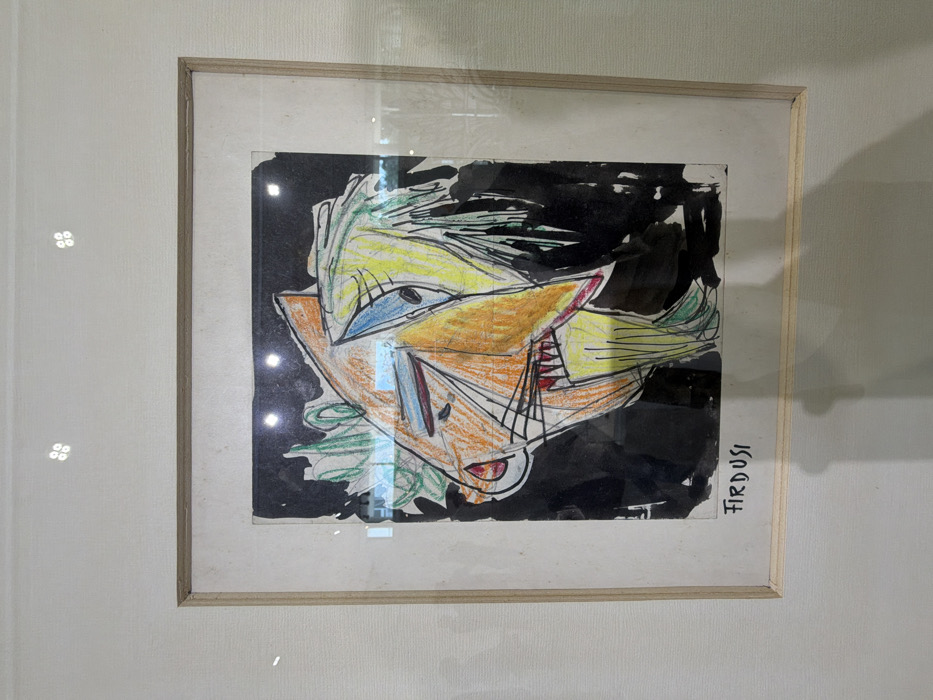 The image displays a framed artwork, likely a drawing or mixed-media piece, hanging on a textured, light-colored wall in the Hof HaCarmel Regional Council, Israel. The artwork depicts an abstract, cubist-style rendition of a head or face, characterized by bold black outlines. The primary colors within the artwork are orange for the main facial structure, yellow for areas around the eyes and jawline, blue for one angular eye, and green suggesting hair or a mane. A red tip is present on the prominent snout-like nose, and sharp white teeth are visible within a red-lined mouth. The background of the artwork is a solid black. The name "FIRDUSI" is written in black capital letters at the bottom-left corner of the art piece, above the white matting. The artwork is contained within a light-colored wooden frame and covered by a reflective glass or acrylic pane. Reflections on this surface include multiple pairs of bright, square-shaped lights in the upper portion and a horizontal greenish-blue light streak across the mid-left area of the artwork. No individuals are depicted in the scene.