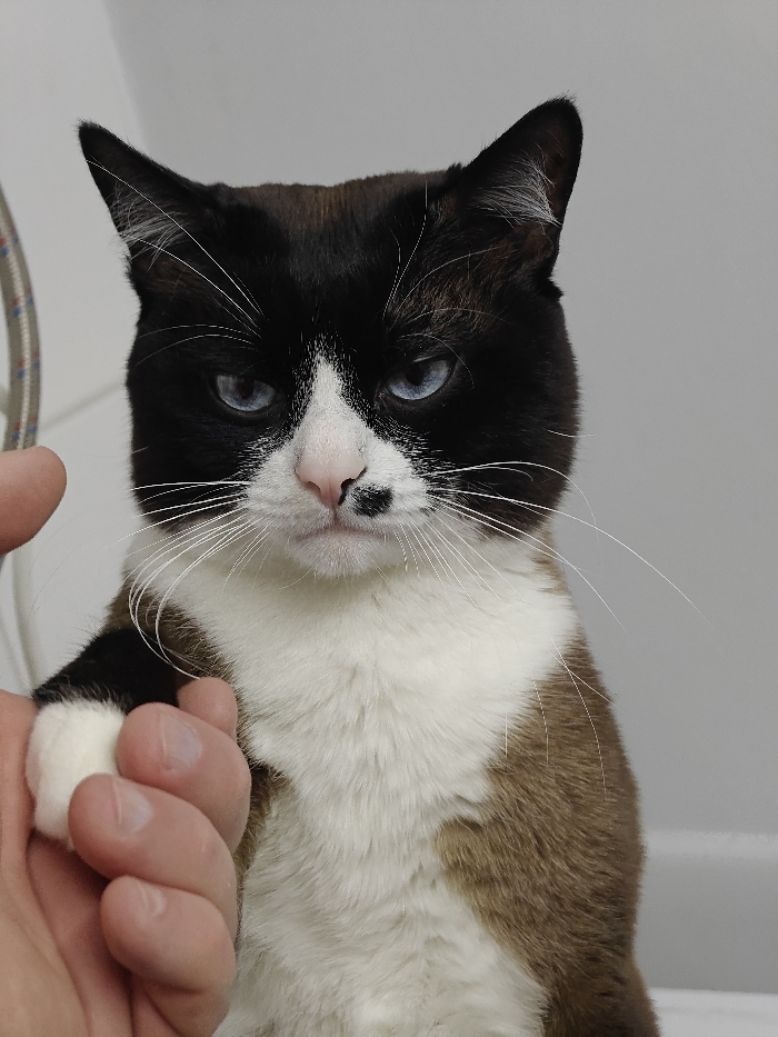 A grumpy-looking Siamese cat with striking blue eyes stares at the camera. The cat has a dark brown mask, a white chest, and light brown fur on its lower body. A human hand gently holds one of the cat's paws. The background is a plain white wall, possibly in a bathroom. The cat's intense expression suggests it may not be enjoying the human's touch.