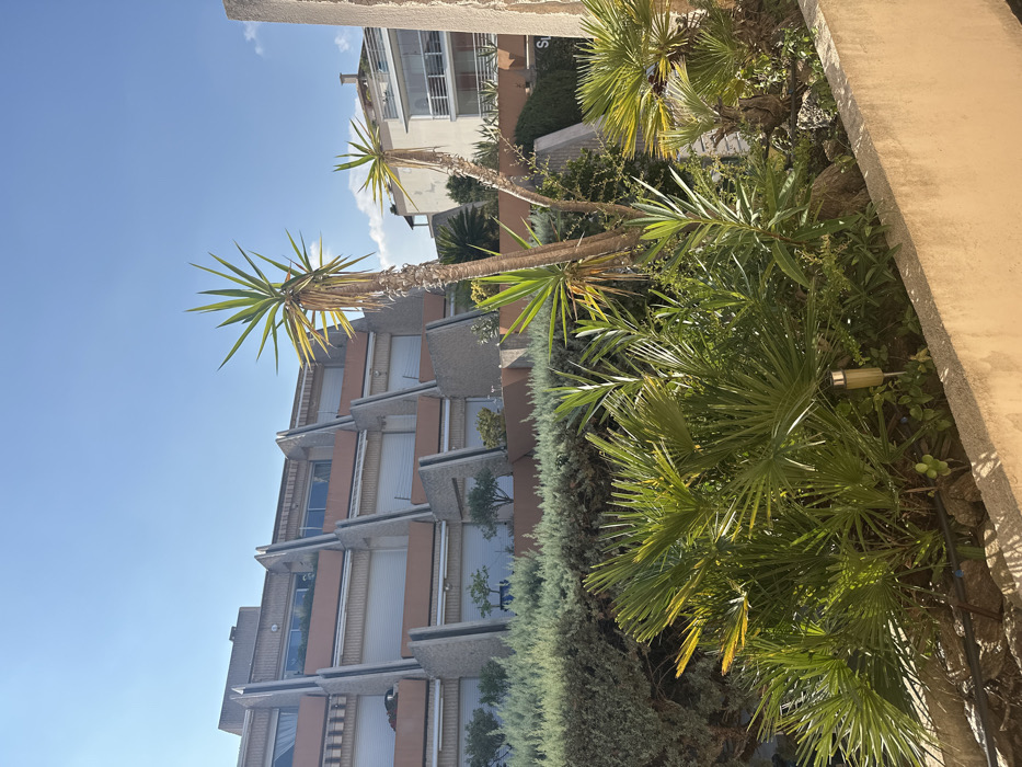 An outdoor, daytime image depicts a terraced residential complex and Mediterranean vegetation under a clear blue sky in Cavalaire-sur-Mer, France