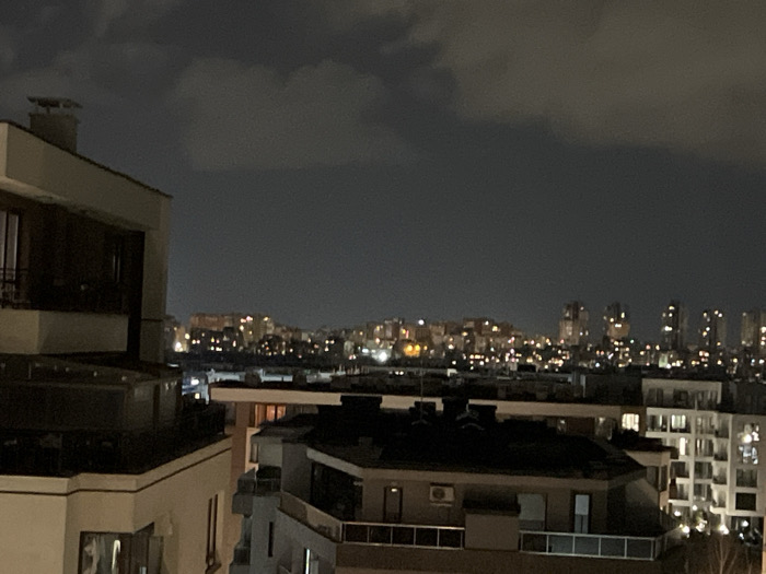 This image depicts an urban night scene in Sofia, Bulgaria, observed from an elevated vantage point. The sky is dark and overcast with visible cloud formations. In the immediate foreground to the left, a portion of a modern building with a light-toned exterior, dark window frames, and a visible chimney stack is present. Balconies with dark railings are apparent on this structure. The midground features the rooftops and upper levels of multiple buildings; one structure exhibits a flat, dark roof and an external air conditioning unit on its facade, while another multi-story building to the right shows numerous illuminated windows. The background presents a sprawling city skyline characterized by a dense array of artificial lights, including streetlights and illuminated windows from numerous residential and commercial buildings. Clusters of taller, multi-story structures are discernible in the distance, particularly towards the right side of the horizon. No individuals or specific actions are identifiable within the frame. The scene is static and devoid of human interaction.