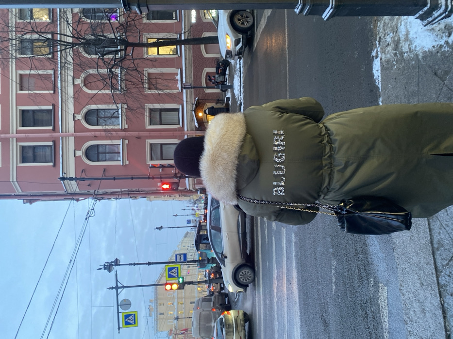 The image captures an urban street intersection in Saint Petersburg, Russia, during what appears to be a late afternoon or early evening on an overcast winter day, evidenced by the light grey sky and patches of dirty snow and slush on the ground. In the foreground, a person is seen from behind, standing on a sidewalk facing the street, presumably waiting to cross. The individual wears a long, olive-green winter parka featuring a prominent light-colored fur trim around the hood. The back of the coat prominently displays the word "BLUGIRI" in shiny, possibly studded or sequined, lettering. A black shoulder bag with a silver chain strap is carried over the person's left shoulder. The street is active with vehicular traffic. Several cars are visible, including a light-colored SUV in the mid-ground and a dark van further down the street. Exhaust vapor is faintly visible near some vehicles. Traffic lights are present: a solid red traffic light is visible on the right, and further down the street, a yellow traffic light is accompanied by a green pedestrian "walk" signal. A blue square pedestrian crossing sign is affixed to a pole. The road surface is dark and appears wet, with a white pedestrian crosswalk partially visible. Overhead wires crisscross the frame, and ornate black lampposts are scattered along the street. To the right, a multi-story building with a distinctive reddish-pink facade and white trim occupies a prominent corner. It features a mix of rectangular and arched windows on various floors. A tree with bare branches stands in front of this building. At street level, a lighted entrance is visible, with a dark-clad individual standing near it. In the background, across the intersection, another multi-story building with a lighter, possibly cream or pale yellow, facade is visible.
