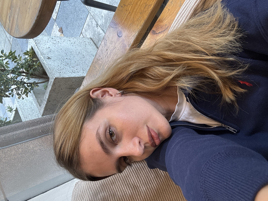 A fair-skinned female, approximately 20-30 years of age, with long, light brown hair, is depicted from the chest up, looking directly at the camera with a neutral expression. She wears a navy blue half-zip pullover with a red embroidered polo emblem on the left chest, over a white t-shirt. A small silver-colored hoop earring is visible on her left ear. Her head and left shoulder rest on a light beige ribbed surface, indicating seating on a cushioned bench or sofa. The background shows an indoor setting overlooking an outdoor patio area through a glass partition. The outdoor area features light grey square paving stones, two light grey concrete rectangular planters containing small green leafy plants, and a partial view of a round wooden table with a dark metal base. A wooden counter or bench is visible within the indoor space to the right of the subject. The location is identified as a Coffeesta cafe in Tbilisi, Georgia, consistent with the architectural and design elements of branches such as the one on Rustaveli Avenue.