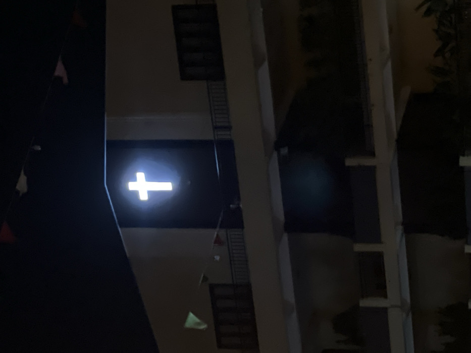 The image depicts the exterior of the Saigon Evangelical Church (Hội Thánh Tin Lành Sài Gòn) at 155 Trần Hưng Đạo, P. Cô Giang, Quận 1, Ho Chi Minh City, Vietnam, at night. The central feature is a brightly illuminated, white-glowing cross mounted on a dark, recessed panel on the upper facade of the multi-story building. The building itself is a light-colored structure with visible balconies on at least two levels, featuring dark railings. Dark, recessed windows or doors are discernible on the upper level, flanking the central cross panel. Triangular pennant flags (bunting) in various colors, including red, white, and green, are strung across the top portion of the frame, indicating a festive or decorative arrangement. The overall environment is dark due to the nighttime setting, with light primarily emanating from the cross and ambient reflections on the building surfaces. No individuals are present in the scene.