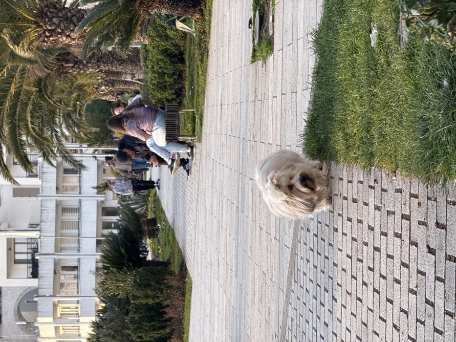 The image displays a paved promenade in Tivat, Montenegro. In the foreground, a light-colored, long-haired dog, resembling a Havanese, walks from the left towards the right on a pathway constructed of light grey rectangular paving stones. A strip of green grass borders the pathway on the right. In the midground, a dark metal park bench accommodates three individuals. A female with long brown hair, wearing a light pink jacket and light blue jeans, is seated on the right side of the bench. To her left, a male in a dark jacket and dark pants is seated, focused on a smartphone held in his hands. A third individual is partially visible to the left of the male. Further along the pathway, two additional male figures walk away from the viewer. The immediate environment includes multiple tall palm trees, green bushes, and various landscaped plants. In the background, a multi-story white building with balconies and numerous windows is visible under direct sunlight.