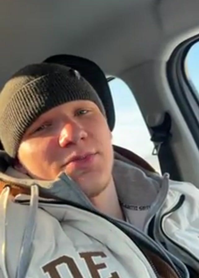 A young man with fair skin, light brown hair, and blue eyes is sitting in the driver's seat of a car. He is wearing a dark gray beanie, a gray hooded sweatshirt, and a white and brown jacket with the word "RIDE" printed on it. The car's interior is visible, including the headrest, seat belt, and door panel. The sky is visible through the car window. The man is looking directly at the camera, talking, and briefly smiling.