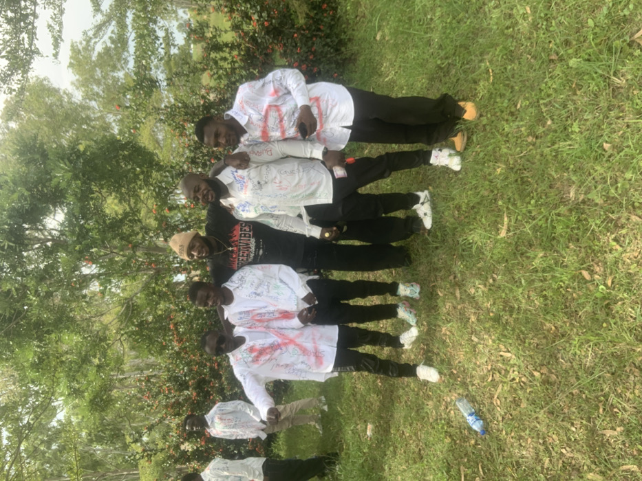 The image portrays an outdoor scene in Katon Rikkos, Nigeria, featuring a group of young adult males. In the foreground, five men are standing on a grass-covered ground. The central figure wears a black t-shirt with "FREED VIBES" text, a light brown beanie, and a silver cross pendant, with his arms around the shoulders of the two men adjacent to him. Four of these five foreground individuals wear white long-sleeved button-down shirts covered extensively with handwritten colorful signatures and messages. The man on the far left wears dark trousers and white sneakers. The man next to him wears dark sunglasses, dark trousers, and multi-colored sneakers, extending his right arm forward with an open palm. The man to the right of the central figure wears dark trousers and white sneakers, holding a small red object in his right hand. The man on the far right wears dark trousers and tan boots, holding a black smartphone in his left hand. Two additional men, also in white marked shirts, are partially visible in the left background. The environment consists of a vibrant green grassy field, with a dense line of green trees and shrubs, some bearing small red growths, forming the backdrop. A clear plastic water bottle lies on its side on the grass in the lower-left foreground.