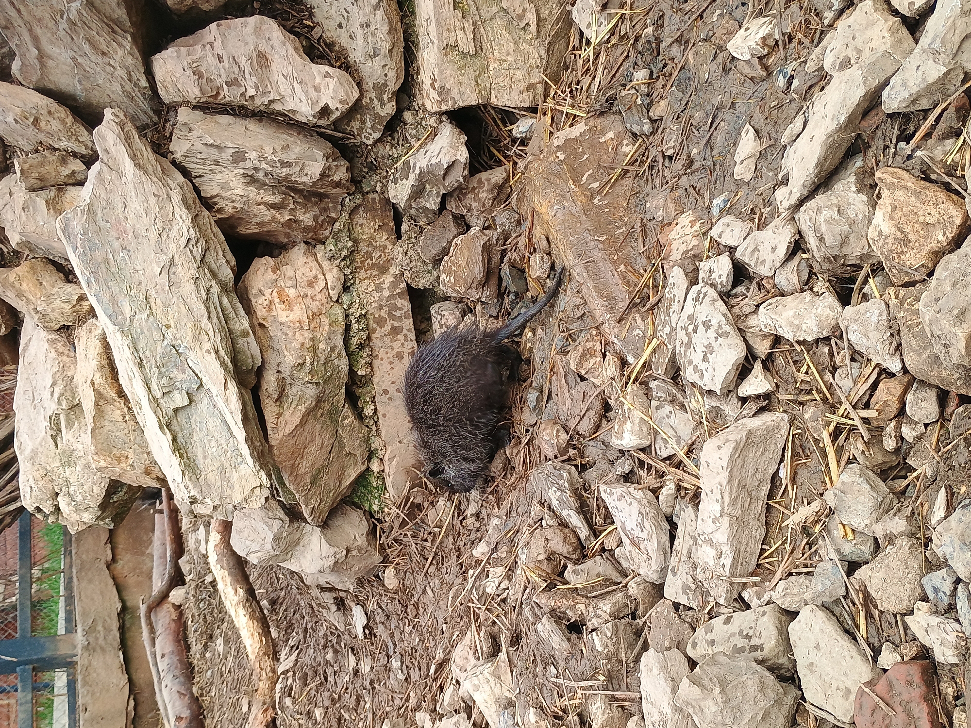 A dead, dark-furred animal, possibly a rat or similar rodent, lies among light-colored rocks and mud. The animal is positioned near the center of the frame. The rocks vary in size and shape. Debris such as straw-like material is scattered throughout the scene. A section of a metal fence and possible building elements are partially visible in the lower left corner of the image. The location is outdoors and appears to be ground level, possibly on a hillside or embankment. There is no readily apparent evidence or indications of a specific location in Stara Zagora, Bulgaria.