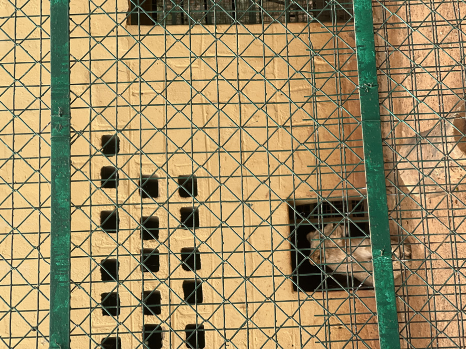 A green, diamond-patterned wire fence obscures most of the view. Behind the fence is a tan wall with square openings. Through one of these openings, the head of a light-colored lion is visible. The lion appears to be resting or observing from within the enclosure. Another section of wall, slightly darker in color, is visible on the right side of the frame, also partially obscured by the fence.