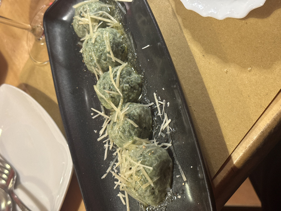 - "Five green, spherical food items, consistent with gnudi or spinach dumplings, are arranged in a linear formation on a black, rectangular serving plate" by FM-IdNfF2, licensed under CC BY 4.0
