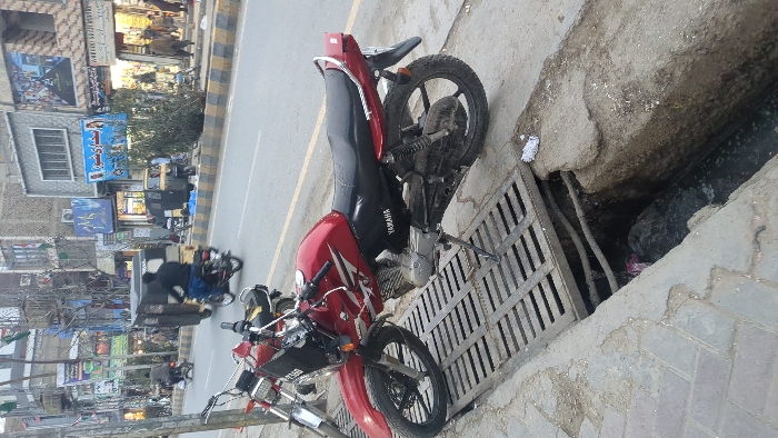 This image depicts an urban street scene in Quetta City Tehsil, Pakistan. In the immediate foreground, a red and black Yamaha motorcycle is parked on a concrete sidewalk, facing left. Its kickstand is deployed, and the front wheel rests partially on a metal grate covering an open concrete drainage channel. The channel contains murky water and debris, with exposed pipes visible along its wall. Adjacent to the Yamaha, a second, partially visible motorcycle is also parked. The sidewalk shows signs of wear, including cracks and uneven paving. The midground features a two-lane asphalt road separated from the sidewalk by a curb painted with yellow and black stripes. Traffic is moving away from the viewer. A black three-wheeled auto-rickshaw is central, followed closely by a person riding a blue motorcycle. Further down the street on the opposite side, another yellow three-wheeled auto-rickshaw is parked near the curb. Several pedestrians are visible on both sides of the street. The background consists of a row of multi-story commercial buildings lining the far side of the street. These buildings feature various storefronts with illuminated signs displaying text in Urdu and some English, advertising businesses such as clothing or electronics stores. Overhead, numerous electrical wires and utility lines are strung across the street. The sky appears overcast.