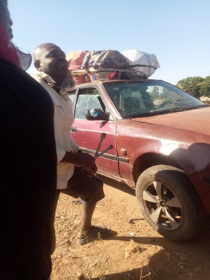 In Damakasuwa, Nigeria, a daylight scene features a dark-skinned male subject, mid-adult with a bald head, positioned beside the front passenger side of a maroon sedan. He is wearing a light-colored long-sleeved shirt and dark shorts, with a dark slide sandal visible on his left foot. He holds a silver cross-wrench in both hands, positioned near the vehicle's wheel. His mouth is slightly open, suggesting speech or an expression. The sedan, appearing aged with faded paint or rust, is heavily laden with various wrapped bundles of luggage or cargo secured to a roof rack. The front passenger wheel, equipped with multi-spoke alloy rims, is visible. A dark object, possibly another tool, lies on the dusty, arid ground near this wheel. Sparse dry vegetation is scattered across the ground. A partial view of a second individual, wearing dark clothing and a red head covering, is visible on the far left of the frame. The background shows a clear blue sky, with trees and rudimentary structures in the distance, consistent with a rural or semi-urban environment. The overall scene suggests a roadside tire-related maintenance activity.
