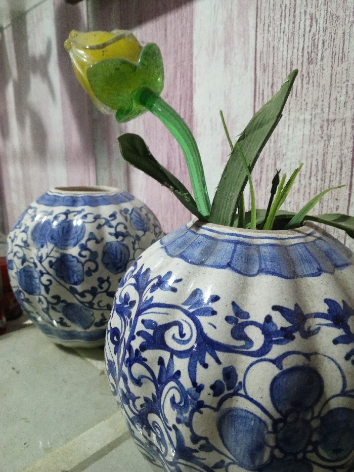 The scene is set indoors in Longmiang, Laos. Two round, lobed ceramic vases, approximately 20-25 cm in diameter, are displayed on a light-colored, flat surface. Both vases are off-white with intricate cobalt blue floral and foliate patterns. The vase in the foreground, positioned slightly to the right, contains an artificial yellow flower with a green stem and sepals, appearing to be made of glass or plastic. Several slender green artificial leaves and one broader, darker green artificial leaf are also arranged within this vase. The second vase, slightly out of focus and positioned behind and to the left of the first, is empty of contents. The background consists of a vertical paneled wall, displaying alternating light pinkish-purple and white stripes or wood grain patterns. No individuals are present. No overt actions or interactions are depicted.
