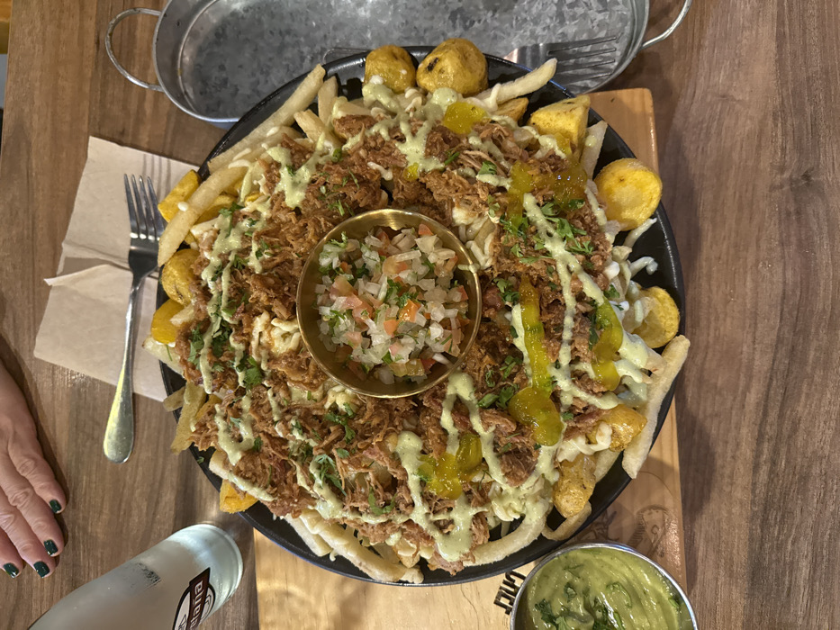 - "This image captures a close-up, top-down view of a loaded food platter served on a wooden table in a casual dining establishment within the city of Cali, Colombia" by FM-7eFDK2, licensed under CC BY 4.0