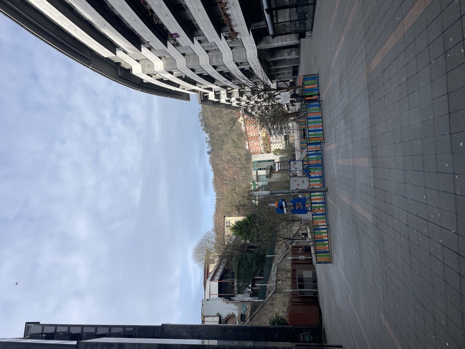 This image depicts a pedestrian area in the city of Eibar, Spain, specifically an urban plaza or street, likely near the Errebal Plazia complex given the architecture. The foreground consists of a grey tiled pavement with lighter grey and faint orange/yellow striped sections. To the left, a tall, dark, multi-story structure with reflective surfaces partially frames the scene. Behind it and elevated, older, light-colored buildings with red-tiled roofs are visible, some partially obscured by dense green foliage and trees. A set of stairs leads up to this elevated section. Below the stairs, a series of dark brown, rectangular utility boxes or structures are present. In the midground, a children's playground is enclosed by a colorful fence composed of vertical slats in alternating blue, green, orange, and yellow. Inside, a blue and white play structure with a slide and climbing elements is visible. Two indistinct individuals appear to be near the playground area, slightly to the left of its center. To the right, a prominent, modern multi-story residential or commercial building with a distinctive curved facade dominates the view. It features horizontal balconies and alternating light grey and white paneling. At its base, a glass-paneled structure, possibly a bus shelter or retail front, is present. A single person is faintly visible walking near the entrance of this building. The background is dominated by steep, tree-covered hills rising behind the urban development. Patches of various buildings, some with reddish-orange facades, are scattered across the lower slopes of these hills. The sky is largely overcast with grey and white clouds, though hints of brighter blue are visible. A small dark object, possibly a bird, is in flight in the upper left sky. The overall lighting suggests a clear but overcast daytime.