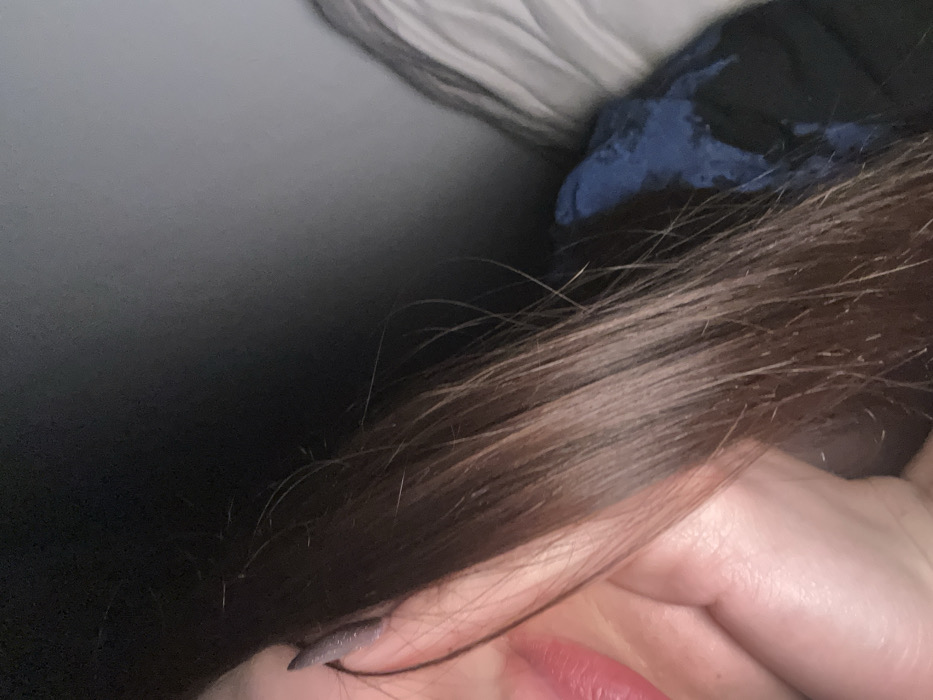The image depicts a close-up, dimly lit indoor scene showing a partial view of a person. The subject's left side of the face is visible, including a portion of the chin, cheek, and the left corner of the mouth with reddish-pink lips. Long, dark brown hair flows from the left across the center of the frame. A finger, possibly part of a hand, is positioned near the ear/cheek area on the left, with an elongated, pointed fingernail featuring light purple or gray glitter nail polish. In the upper right background, a blurred light gray object, consistent with bedding or a pillow, is present next to a dark garment with irregular blue or white patterns. The background is largely dark and indistinct, transitioning from black in the upper left to dark gray in the upper right. There are no discernible features within the image to identify its specific location in Dimitrovgrad, Bulgaria, or any other geographic location.