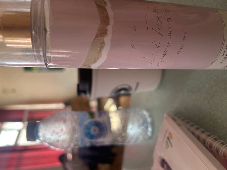 This image presents a forensic view of an indoor setting in Yambol, Bulgaria. In the foreground, a tall, cylindrical pink body mist bottle stands upright, sharply in focus. The bottle has a clear plastic cap over a gold-toned sprayer and features a pink body with a horizontal, textured band resembling torn paper. Visible text on the bottle identifies it as "BODY MIST," "sweet tooth," "BY SABRINA CARPENTER," and "MADE WITH LOVE." Behind the body mist bottle, to its left, are two blurred objects: a clear plastic bottle, approximately half-full of water, with a blue and white label featuring a prominent circular logo; and a white disposable coffee cup with a black lid, displaying a dark, circular logo on its side. A white spiral-bound notebook or planner is partially visible in the lower-left foreground. All items rest on a light green or teal-colored flat surface, consistent with a tabletop or desk. The background is heavily blurred but reveals red curtains on the far left, a light-colored wall, and an indistinct human figure seated in the distance behind the water bottle. The scene is illuminated by ambient light, likely originating from a window obscured by the curtains. No direct actions or interactions are depicted.