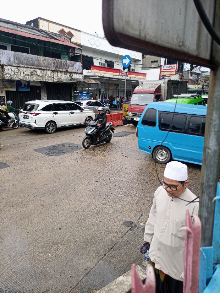 An urban street scene shows various vehicles in motion: a motorcycle, cars, a red truck, and a small blue bus. Pedestrians walk along the sidewalks. Above the street, a blue sign with a white arrow indicates direction. Buildings line the street, including one with an "Alfamart" sign. A man wearing a white cap and glasses stands near the camera, partly obscured by a blue and red metal fence. The sky is overcast.