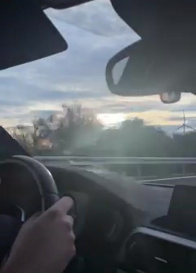 The video, taken from inside a moving car, shows a field of wind turbines at sunrise