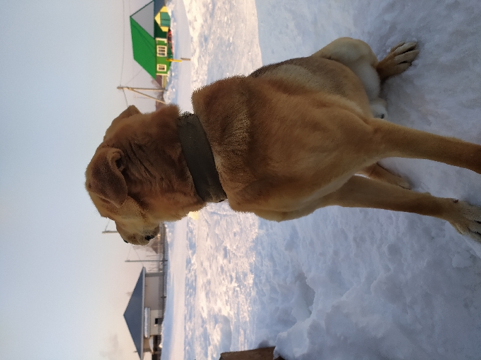 - "A light-brown domestic dog, wearing a dark collar, is depicted sitting on snow-covered ground, facing left and looking away from the camera" by FM-k5zVp2, licensed under CC BY 4.0