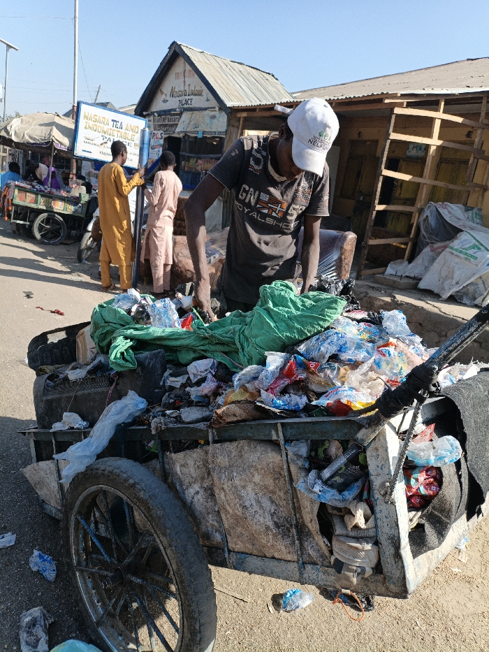 The scene depicts a daytime street in Gawuna, Nigeria. In the foreground, a male individual wearing a white baseball cap with a green logo, a dark grey t-shirt featuring "GN ROYALSHOP" text, and dark pants, is actively sorting through a large, heavily laden two-wheeled handcart. The cart is filled with assorted refuse, including numerous plastic bottles, various plastic bags, and green fabric. Discarded plastic items are scattered on the dusty ground around the cart. In the midground, two additional males are present. One, in an orange-brown traditional garment, stands near a blue and white sign post displaying "NASARA TEA AND INDOMITABLE PLACE" and "PALACE". Another male in a light-colored garment stands behind him. The background features several informal market structures with corrugated metal roofs and wooden framing. One structure prominently displays a sign stating "Nasara Indomie PLACE". To the left, a smaller market stall with a canopy is visible. The sky is clear and blue. A street light pole rises in the upper left of the frame.