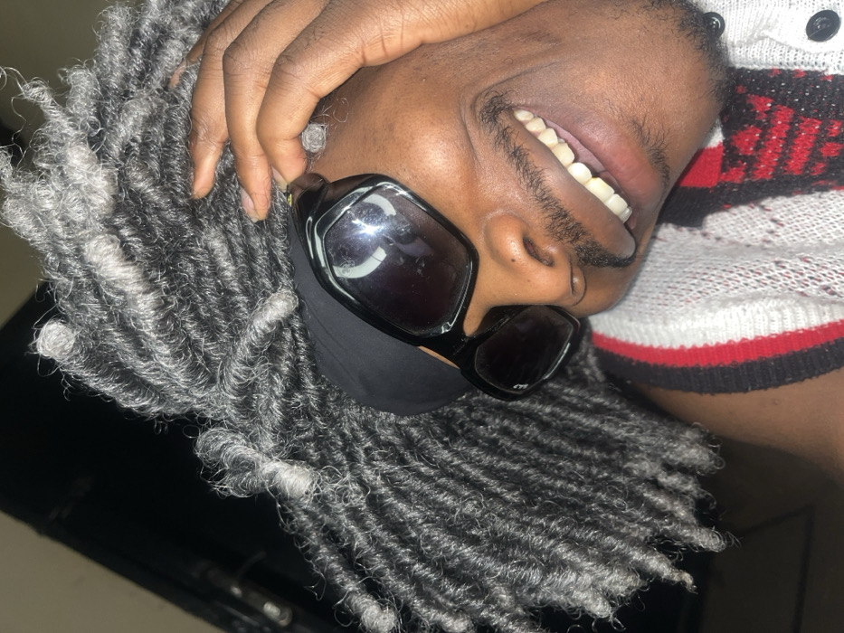 A person with gray dreadlocks and dark sunglasses smiles at the camera. Their head is tilted to the right, and their hand is near their ear. They wear a black mask under the sunglasses and a sweater with white, red, and black stripes. A dark surface is visible in the background. The lighting is dim, creating shadows.