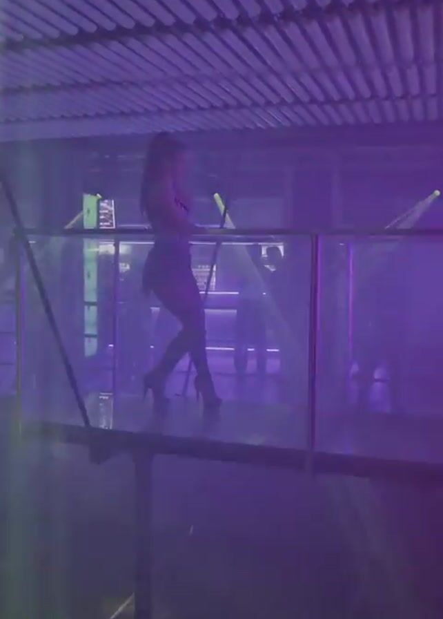 A female dancer wearing a shiny striped bodysuit and high heels performs on an elevated platform in a nightclub. The space is dimly lit with green and purple lighting effects and fog. Behind the platform is a bar and several people. The platform has a glass railing and is supported by metal poles. The dancer moves energetically to the music. The ceiling above has a corrugated metal appearance. The camera angle is low, looking up at the platform.