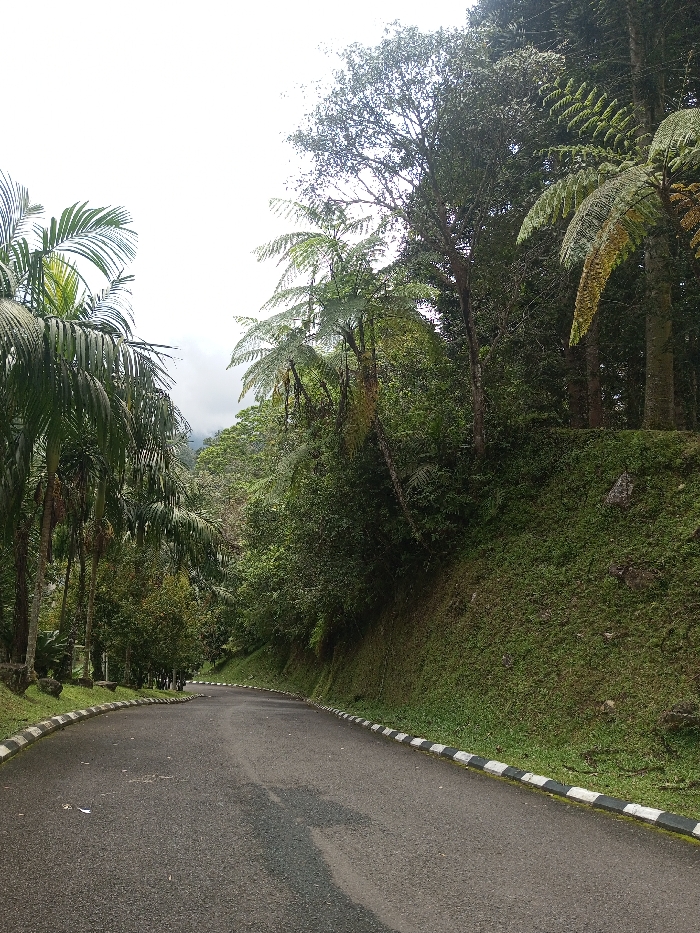 The image depicts a paved asphalt road in Padegaon, India, curving gently to the left and ascending slightly. Both sides of the road are delineated by a curb featuring alternating black and white segments. On the left side, beyond the curb, a grassy area leads to a line of palm trees with green fronds, followed by a dense cluster of various green foliage. On the right side, immediately adjacent to the curb, a steep embankment covered in dense green grass and various trees, including several prominent tree ferns, rises sharply. The background shows extensive green vegetation, suggesting a heavily wooded or forested area, under an overcast, light grey sky with distant hills partially obscured by clouds. No individuals, vehicles, or observable actions are present within the scene.