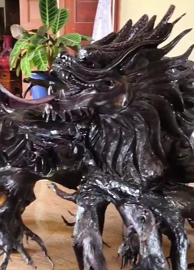wooden dragon sculpture in a home setting. The sculpture is dark brown and glossy, with intricate details carved into its surface. It features a dragon head with visible teeth and a long body, appearing to be made from the roots of a tree. The sculpture sits on a wooden floor. In the background, there's a potted plant, a doorway, and other furniture pieces. A framed picture hangs on the wall behind the sculpture. The camera moves around the sculpture to showcase its details from different angles.
