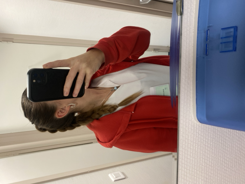 A woman with a long braid down her back, wearing a red hoodie over a white top and a silver necklace, holds a black phone in her left hand, partially obscuring her face. The image is a mirror selfie taken in a room with a white wall, white door, and a blue container. A white electrical socket is visible on the wall. The woman is wearing small silver earrings. A green card or tag is attached to the hoodie.