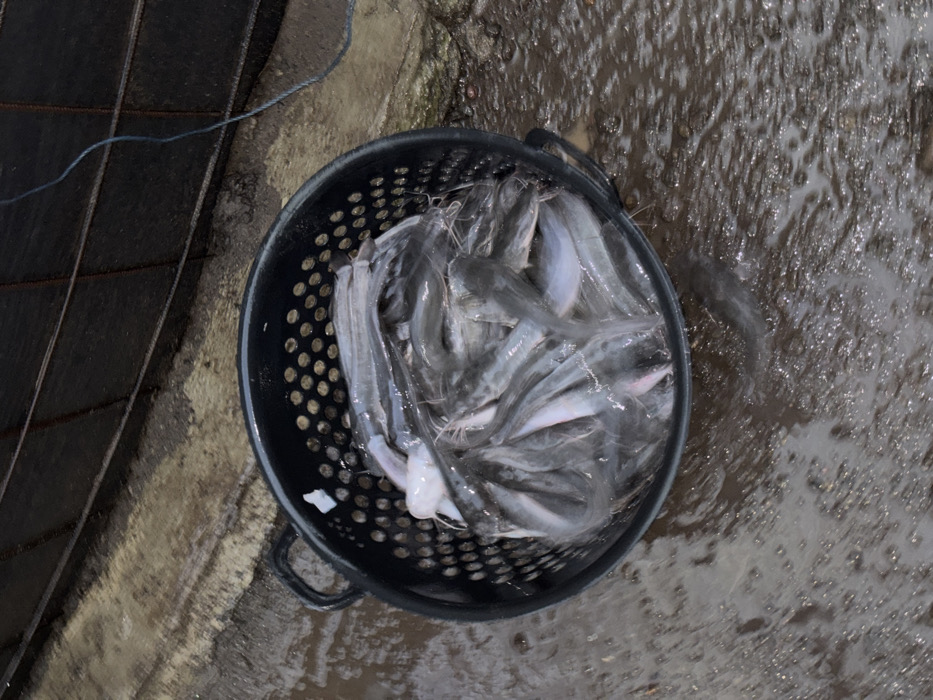 A black, perforated plastic basket containing numerous live, greyish-silver catfish is situated on a wet, dark brown ground surface in Tambakrejo, Indonesia
