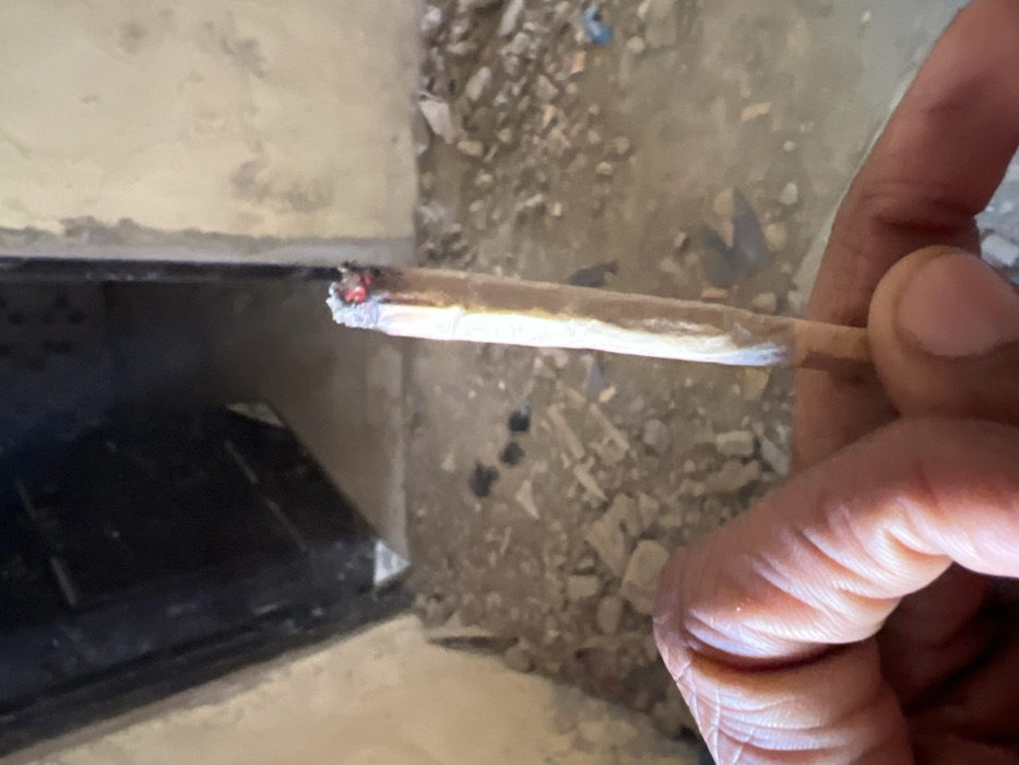 A close-up photograph depicts an adult human right hand holding a lit, hand-rolled smoking implement