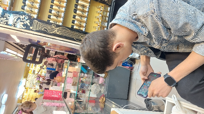 This image depicts an interior scene within a retail establishment located in the city of Barza Municipality, Syria. In the foreground, a male individual with short dark hair, wearing a light-colored acid-wash denim jacket over a lighter shirt and dark pants, is seated. He is holding a purple-cased smartphone horizontally with both hands, actively viewing its screen, and a dark smartwatch is visible on his left wrist. Adjacent to him on the left, a silver electric kettle and a white container are visible. The background reveals a shop environment with multiple display shelves and cases. To the left, a glass display case contains various packaged items, including perfume bottles, small decorative objects, and boxes. Several out-of-focus individuals are partially visible behind this display. To the right, tall shelves are stocked with numerous uniform gold-colored aerosol cans or bottles, some bearing Arabic script, and smaller decorative perfume bottles are arranged on a lower shelf. A black ring light on a stand is positioned in the mid-ground. Dark pillars adorned with intricate gold designs frame parts of the shelving. The overall lighting is bright, illuminating the merchandise.