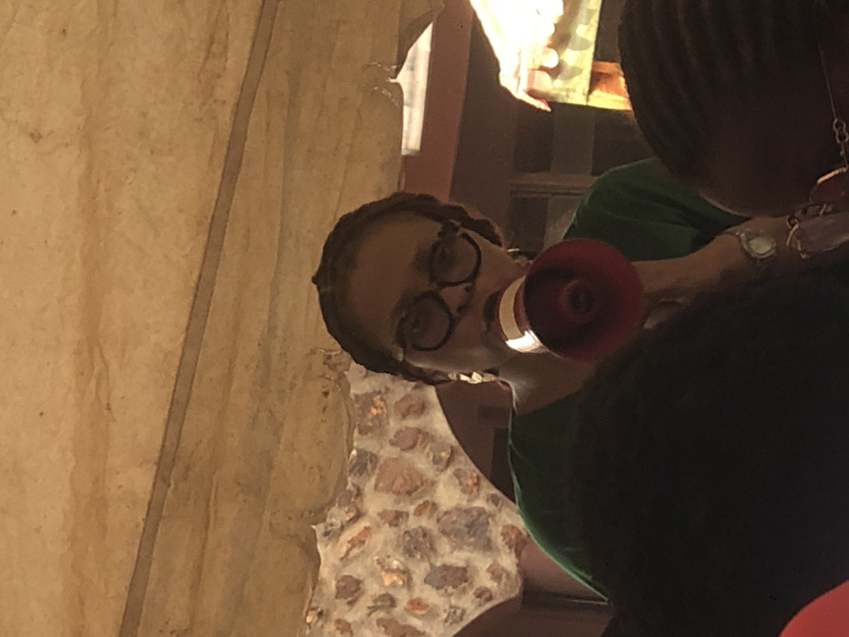 The image displays a female individual, appearing to be of African descent, centrally positioned and actively speaking into a red and white megaphone. She wears a green v-neck top, dark-framed eyeglasses, and gold-toned, leaf-shaped earrings. A silver-toned watch is visible on her left wrist. Her hair is styled in dark braids. In the immediate foreground, the backs of the heads and shoulders of at least two other individuals with dark, braided hair are partially visible, suggesting an audience or gathering. The background features a textured wall section, possibly stone or concrete with embedded rocks, on the left, forming an arch-like structure. Above, a light brown, possibly stucco or wooden ceiling with linear details is visible. The scene is moderately illuminated. The location is Akpaka Forest Reser, Nigeria.