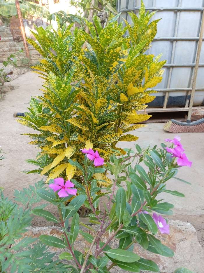The image depicts an outdoor scene in Santo Domingo, Venezuela, under natural daylight. The foreground features two distinct plant species. On the right, a plant with dark green, elongated leaves displays several vibrant pink flowers, each with five petals, consistent with Catharanthus roseus. To its immediate left, a portion of another plant with green, finely-divided foliage is visible, slightly out of focus. The ground surface in the immediate foreground is light-colored earth or sand, with a fragment of a light-toned rock present on the lower right. The central and midground areas are dominated by a tall, bushy Croton plant (Codiaeum variegatum), characterized by its striking variegated leaves featuring prominent yellow and green speckles. In the background, positioned to the right of the Croton plant, a large, light-grey or metallic industrial bulk container (IBC tote) with a visible external metal cage structure is present. Adjacent to this container, leaning vertically, is a broom with a brown handle and a dark-bristled head, resting on the ground. The background on the left side of the frame shows a dirt path leading to indistinct vegetation or obscured structures. No individuals or active interactions are observed within the scene.