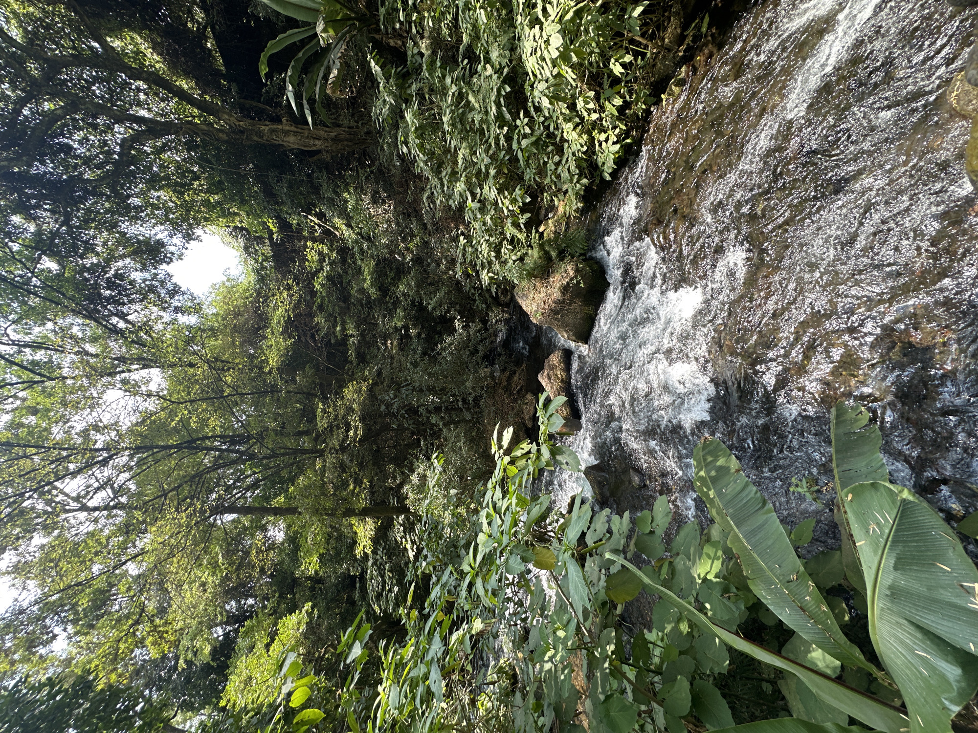 The image depicts a lush, natural environment, possibly a riparian zone or a wooded area adjacent to a stream or waterfall. The location is likely near Uruapan, Mexico. Water flows rapidly over rocks and small drops, creating a dynamic visual texture with white foam. Dense vegetation lines both sides of the watercourse, including various species of trees, shrubs, and possibly banana-like plants, suggesting a humid, tropical or subtropical climate. Sunlight filters through the canopy above, creating dappled light and shadows on the foliage and the water surface. The scene appears untouched by human development, emphasizing the natural beauty of the area.