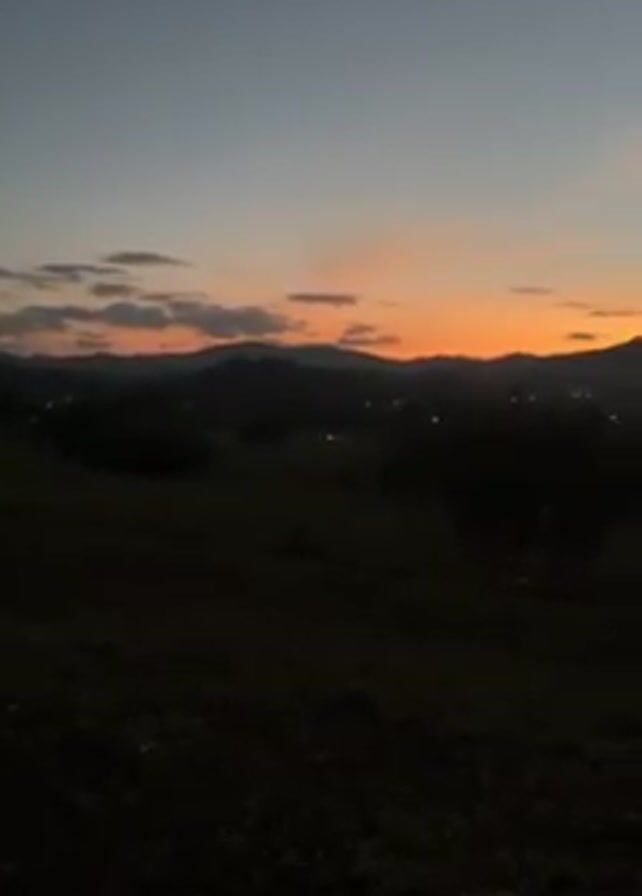 landscape at dusk, likely in a rural or mountainous area. The sky is a gradient of colors from dark blue above to orange and pink near the horizon, suggesting either sunrise or sunset. There are some clouds scattered across the sky. In the distance, there are silhouettes of mountains, and some lights are visible indicating a small town or settlement. The foreground is mostly dark and appears to be a field or grassy area. The overall mood is serene and peaceful.