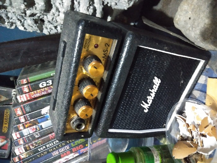 The image depicts a cluttered indoor environment centered around a black Marshall MS-2 miniature guitar amplifier stack