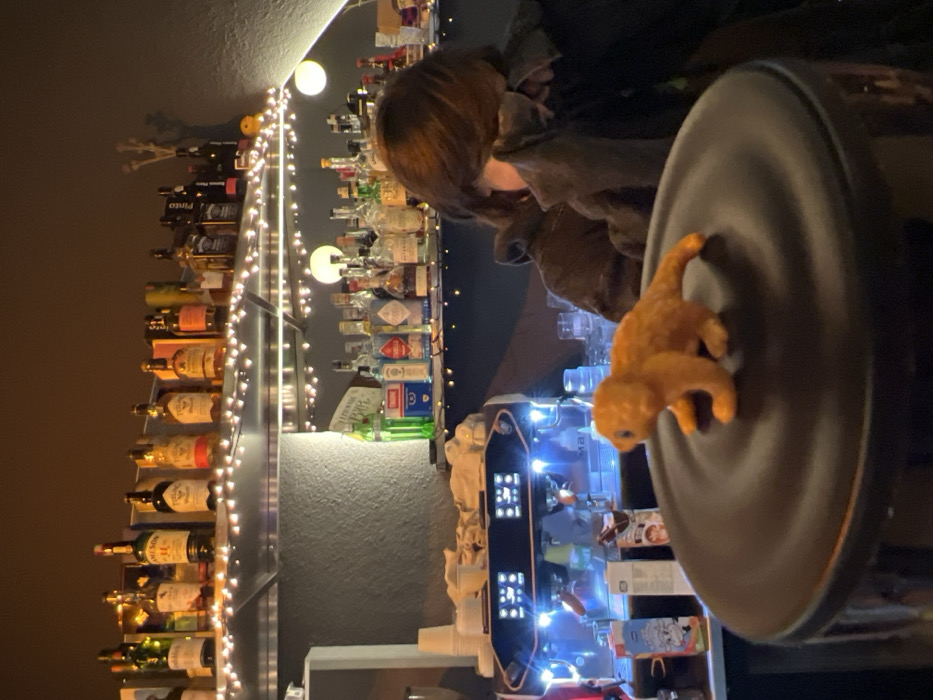 A tilted indoor shot presents a bar setting with a fully stocked liquor shelf illuminated by string lights. A person is partially visible near the shelf. In the foreground, a dark gray object features a small, furry orange creature clinging to it. An electronic device with illuminated screens is below the liquor shelf.