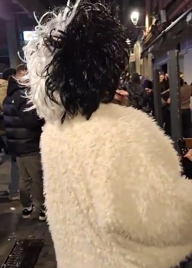 A woman dressed as Cruella de Vil walks down a dark street at night. She is wearing a fluffy white jacket, black pants, and a black and white wig. She is holding a bottle of beer and a cigarette. She turns to the camera and smiles. She then walks towards another woman dressed in grey with a veil. The street is narrow and lined with buildings. There are other people walking around in the background. The scene is dark and lit by streetlights. There is music playing in the background.