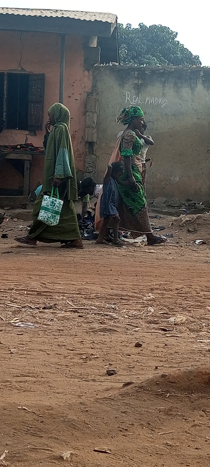 An outdoor scene depicts two women and a child walking on a dirt road amidst scattered debris. The woman on the left wears a green hijab and carries a patterned bag while seemingly engaged in a phone call. To her right, a woman in green patterned clothing walks with a child, who is holding her hand. The background features a worn building with boarded windows and the words "REAL MADRID" spray-painted on a nearby wall. Overhanging foliage and another structure are visible in the distance.