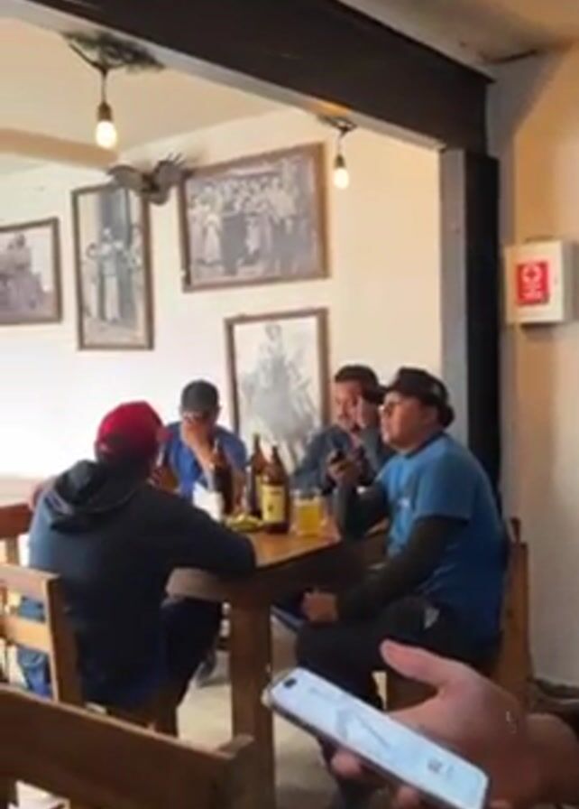 Here is a detailed description of the video. The video shows the interior of a restaurant or bar. Several men are sitting around a wooden table, drinking beer. One man at the end of the table is looking at his cell phone. The table has an assortment of bottles of beer and limes, and the men are seated in wooden chairs. Behind the men are several framed pictures on the wall. There is a white first aid kit mounted on the wall as well. A person in the foreground holds a smartphone up. The camera pans across the room, past another table, to the bar where a woman with curly hair stands. She appears to be looking directly at the camera. A television is mounted above the bar, and beer bottles are lined up behind her. The bar area is decorated with greenery and hanging light bulbs. There is a window next to the bar area.