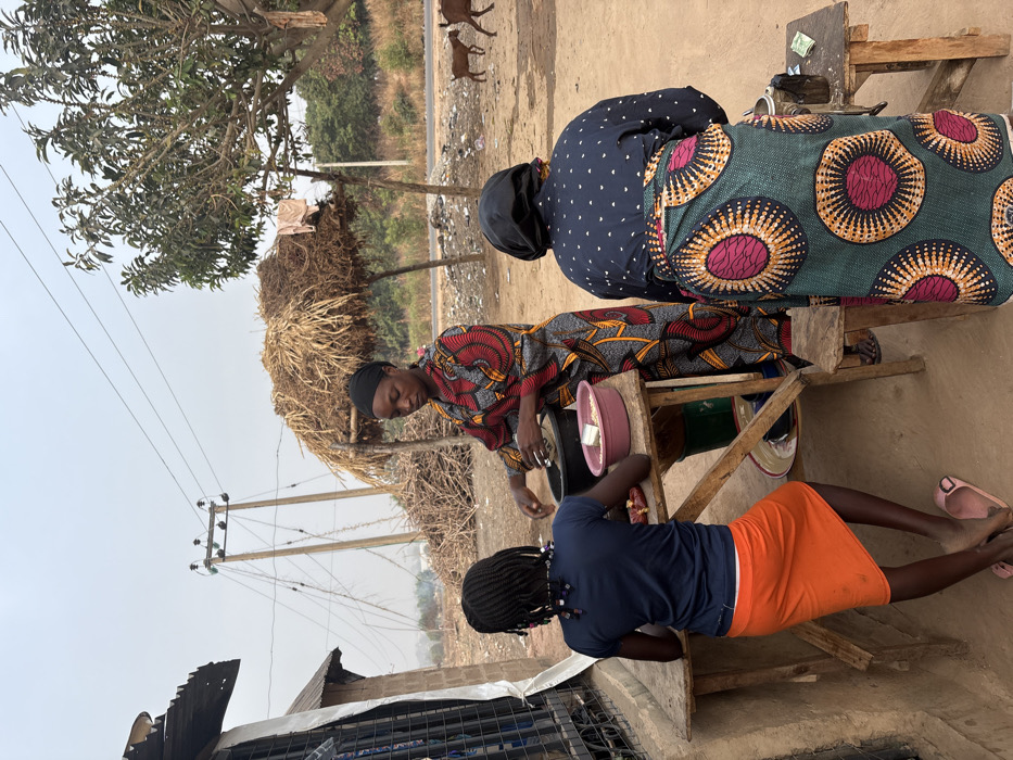 Three women stand around a wooden table with bowls. One woman in an orange skirt is bent down. Another woman in a patterned dress appears to be preparing food. A third woman in a patterned blue fabric stands near the table. A small wooden stool is next to her. Powerlines are in the background. There is a pile of sticks near the table, in front of a road with goats.