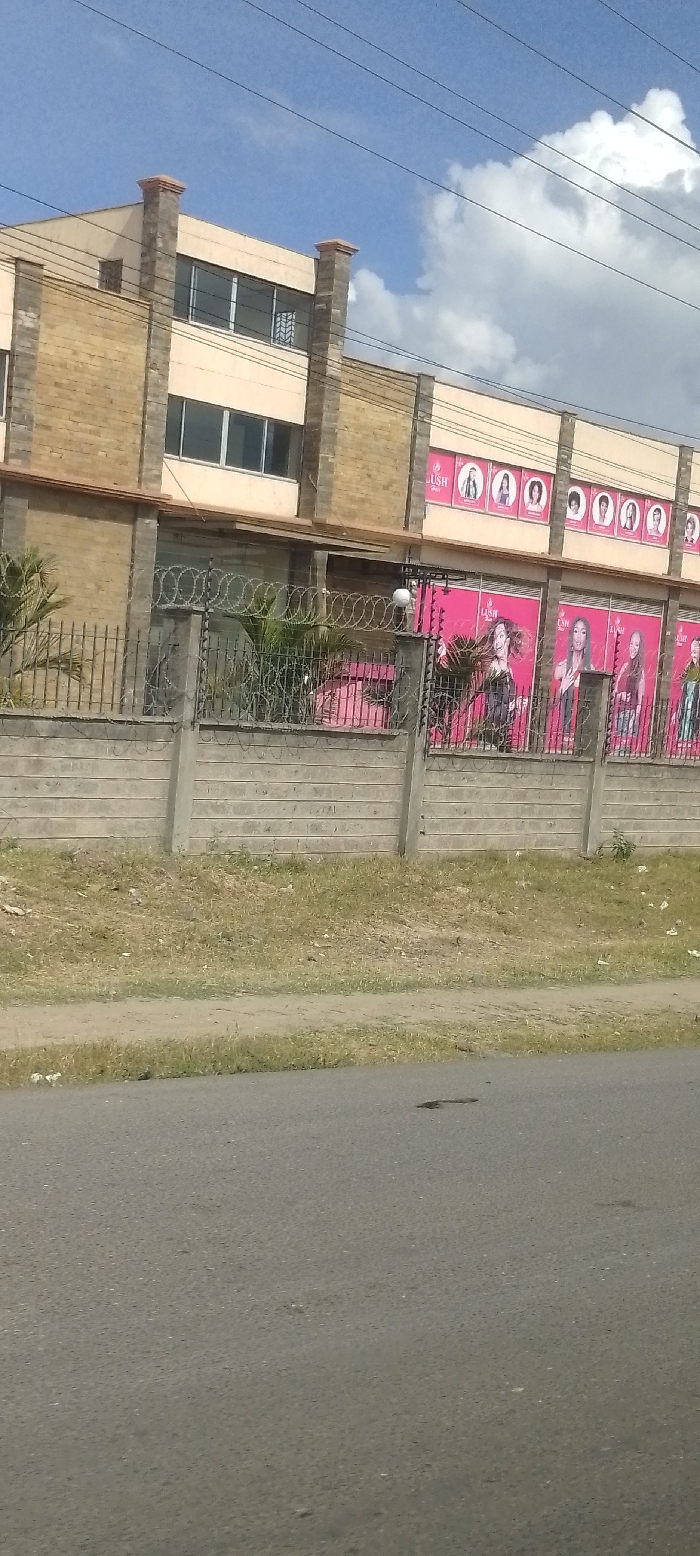 The image displays an exterior daytime scene of a commercial building in Athi River ward, Kenya. In the foreground, a grey asphalt road transitions into a narrow strip of dry grass and dirt. A sturdy pre-cast concrete fence, topped with black metal railings and coiled razor wire, secures the property. Behind this fence, small green plants are visible. The multi-story building features light-colored walls, sections of light brown brickwork, and prominent vertical columns with reddish-brown caps. Numerous windows are present. The building's right facade is extensively covered with vibrant pink "LUSH" branded billboards, displaying images of women with various hairstyles; larger, full-body portraits are on the lower level, and smaller headshot-style portraits are on the upper level. A white spherical light fixture is mounted on the fence. The sky overhead is blue with scattered white clouds, traversed by multiple utility lines. No individuals or specific actions are depicted.