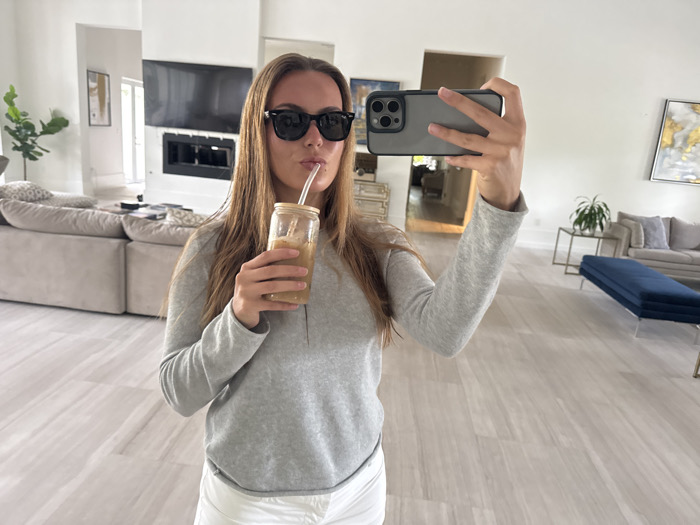 This image captures a young adult female in a modern living space within a residence in Palmetto Bay, United States. The subject, positioned centrally, has long light brown hair, wears black sunglasses, a light grey long-sleeved shirt, and white pants. She is actively taking a mirror selfie with a smartphone, held in her right hand, while simultaneously drinking a light brown beverage from a clear glass or plastic cup with a straw, held in her left hand. Her lips are pursed around the straw. The smartphone has a grey protective case and a visible multi-lens camera system. The background shows a bright, spacious room with white walls and light-colored plank flooring. On the left, a large, light-toned sectional sofa is present, along with a modern white fireplace structure featuring a dark firebox and a flat-screen television mounted above it. A tall green potted plant is situated near the sofa. On the right side of the frame, a dark blue velvet bench with clear acrylic legs is visible, along with a light grey sofa, a small plant on a metallic side table, and an abstract artwork with gold accents on the wall. A large mirror, used for the selfie, is partially visible, reflecting elements of the room.