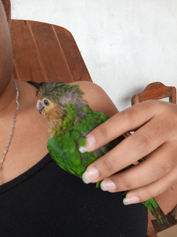 A close-up image depicts the upper right torso of an individual with medium-dark skin tone, located in Altagracia, Venezuela. The individual is wearing a black tank top and a silver chain necklace. A small parrot, predominantly green with yellowish-brown feathers around its face and head, and lighter greyish-brown patches on its crown, is perched on the individual's right shoulder. Its beak is black, and its eyes exhibit a dark pupil within a yellow iris. The individual's right hand, with natural, manicured nails, gently supports the bird's body from behind. In the background, portions of a reddish-brown wooden chair and a light-colored, possibly off-white, textured wall are visible.