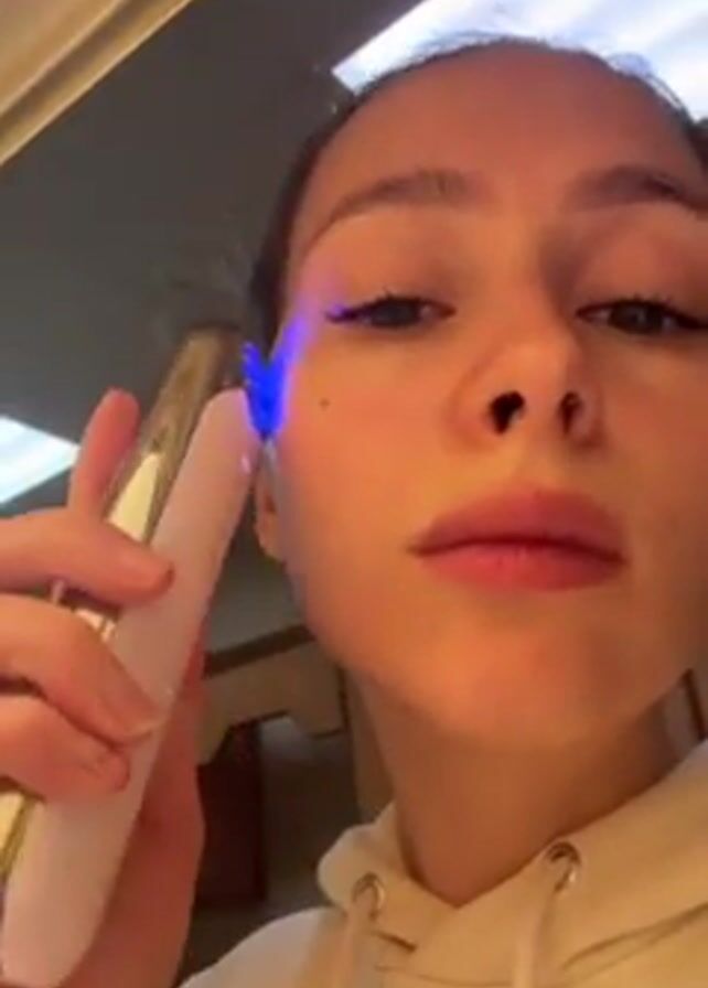 Here is a detailed description of the video: The video shows a woman holding a device in her right hand. The device is slim, with a light pink body and a gold-colored metal applicator end that emits a blue light. The woman is using the device on her face, moving it along her cheek, under her eye, and along her nose. She looks directly at the camera, focusing on her face in a mirror. She is wearing a cream-colored hoodie. The background shows a bathroom interior with light-colored walls, a light fixture in the ceiling, and a glimpse of a wooden cabinet.