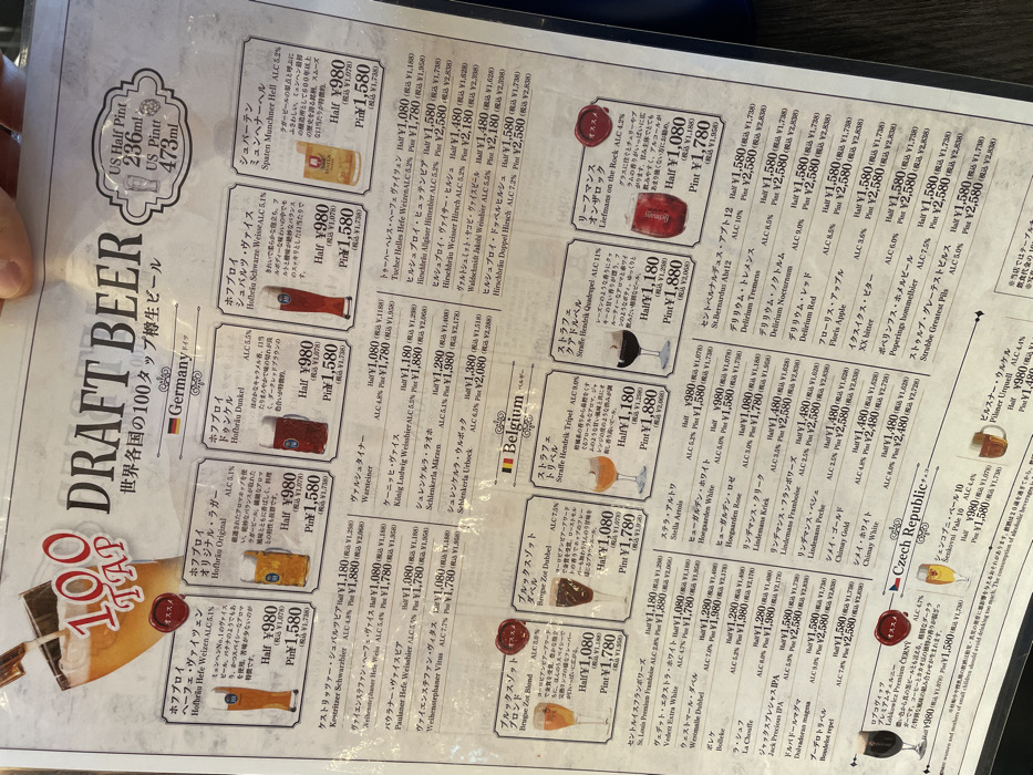 A close-up of a menu for 100 draft beers from around the world. The menu is printed on a white paper with a black border. It features the German, Belgian, and Czech Republic beer sections. The menu features prices and alcohol content for each beer. The menu is located at a restaurant or bar in Sumida City, Japan, at the coordinates 35.71 latitude, 139.812 longitude. The location is unknown beyond this, but the restaurant or bar appears to be a casual establishment. The scene is lit by artificial lighting.