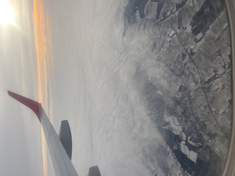 An aerial photograph, captured from an aircraft window, depicts a snow-covered winter landscape under a partly cloudy sky with a low sun