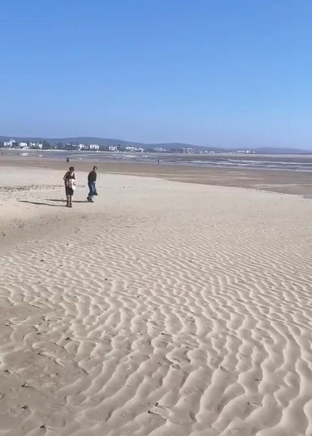 wide sandy beach on a sunny day under a clear blue sky. The sand has a rippled pattern. In the distance, there's a town with white buildings. Two people are walking away from the camera on the beach. Another person is sitting on the sand near the edge of the frame. The ocean is calm, with some visible waves near the shoreline. The beach is mostly empty.